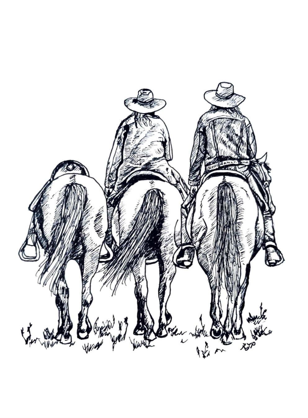 This pen and ink print uses fine lines and parallel-hatching techniques. The composition depicts two riders in coats moving slowly across the landscape, with one leading a saddled horse alongside them. Inspired by a photograph of my sisters, Annie and Maddy.