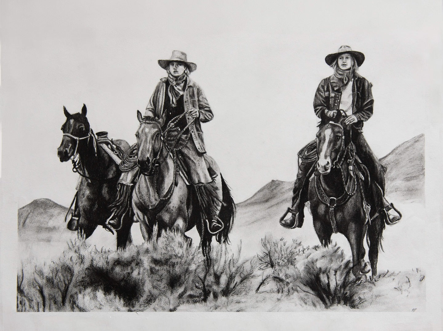 The First Ride of Spring original charcoal drawing depicts two riders mounted on horses with a third horse being led alongside. Rendered on 18x24 inch drawing paper. Drawn from a picture of my two younger sisters bringing out the young green horses for a training ride before the summer riding season.